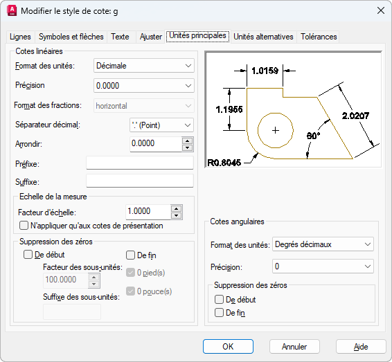 Définit le format et la précision des unités de cotation principales, ainsi que les préfixes et les suffixes du texte de cote.