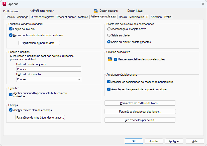 Détermine l’échelle par défaut pour l’insertion de blocs et de dessins dans un dessin lorsque l’échelle d’insertion du dessin actuel est définie sur Sans unité.