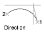 Commence à dessiner l'arc tangent à la direction spécifiée. Cette option permet de dessiner un arc, grand ou petit, dans le sens horaire ou trigonométrique, entre un point de départ (1) et une extrémité (2). La direction est déterminée à partir du point de départ.