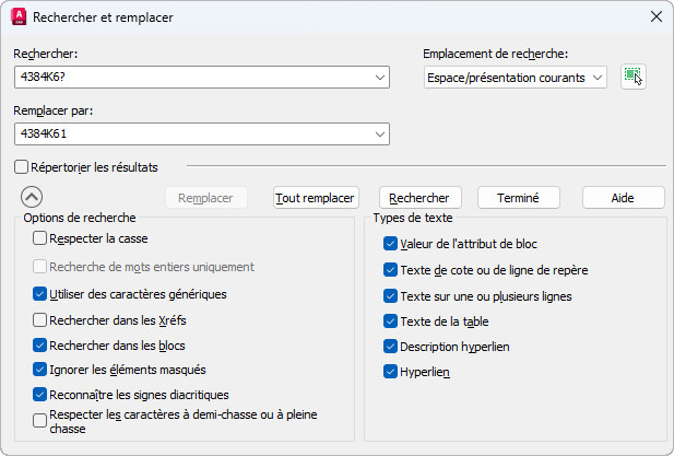 Par exemple, si vous disposez de plusieurs pièces similaires dans votre dessin et que vous devez toutes les modifier sur 4384K61, entrez 4384K6? dans le champ Rechercher et 4384K61 dans la zone Remplacer par.