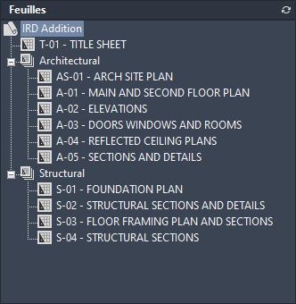 - Les sous-jeux de feuilles sont souvent associés à une discipline, telle que l’architecture ou la conception mécanique. Par exemple, en architecture, vous pouvez utiliser un sous-jeu nommé Structurel ; en conception mécanique, vous pouvez utiliser un sous-jeu nommé Eléments de fixation standard. Dans certains cas, il peut également être utile de créer des sous-jeux associés à un état de révision ou de finalisation. Vous pouvez imbriquer des sous-jeux de feuilles dans d'autres sous-jeux de feuilles, si nécessaire. Après avoir créé ou importé des feuilles ou des sous-jeux, vous pouvez les réorganiser en les faisant glisser dans l'arborescence.