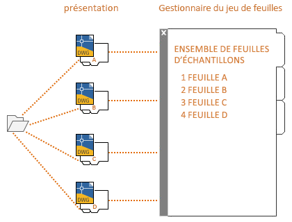 - Un jeu de feuilles est un ensemble nommé et organisé de feuilles issues de plusieurs fichiers dessin. Vous pouvez gérer, transmettre, publier et archiver des jeux de feuilles en tant qu'élément unique.