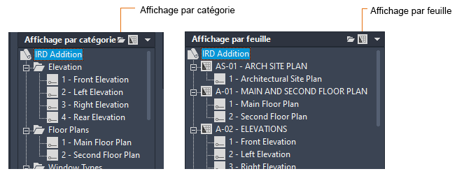 Dans l’onglet Liste des feuilles, les feuilles peuvent être organisées en groupes nommés sous-jeux. Dans l’onglet Vues des feuilles, les vues peuvent être organisées en groupes nommés catégories.