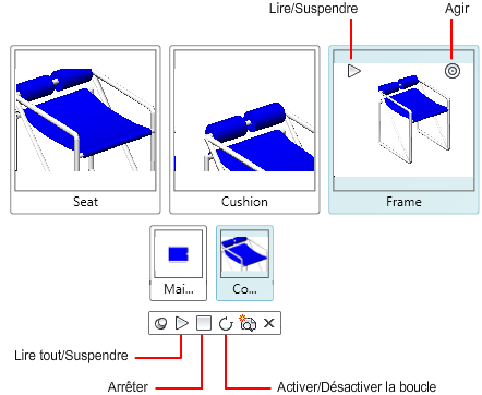 Pour lire l'animation attribuée à une prise de vue créée, utilisez le contrôle ShowMotion ou les contrôles de vue situés sur chaque miniature de prise de vue ou de séquence. Les contrôles de la vue disponibles sont les suivants :