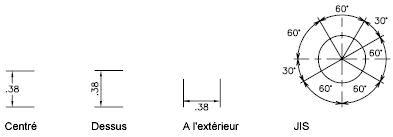 • JIS : Place le texte de cote conformément à une représentation imposée par les normes industrielles japonaises (JIS).