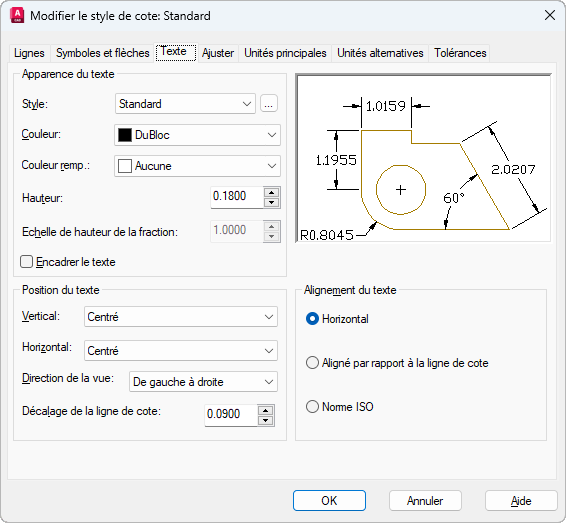 Si le style de texte spécifié dans cet onglet possède une hauteur de texte fixe, cette hauteur remplace la hauteur de texte définie ici. Si vous souhaitez définir la hauteur du texte de cote ici, assurez-vous que la hauteur du style de texte est définie sur 0. Consultez la commande STYLE pour plus d'informations sur la définition de la hauteur du texte pour les styles de texte.