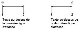 • Côté ligne d'attache 1: Justifie le texte à gauche avec la première ligne d'attache le long de la ligne de cote. La distance entre le texte et la ligne d'attache est égale à deux fois la taille de la pointe de flèche, plus la valeur de l'espace avec le texte. Reportez-vous aux options Pointes de flèche et Décalage de la ligne de cote.