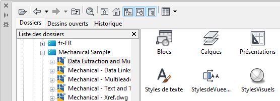 L'arborescence de la partie gauche de la fenêtre DesignCenter et les onglets DesignCenter permettent de rechercher un contenu et de le charger dans la zone de contenu.