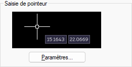 Lorsque la saisie du pointeur (curseur) est activée et qu'une commande est en cours d'exécution, l'emplacement des réticules s'affiche dans les zones de saisie (dans une info-bulle) à proximité du curseur. Vous pouvez entrer des coordonnées dans l'info-bulle plutôt que sur la ligne de commande.