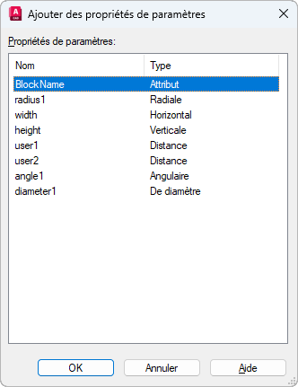 Affiche le nom des paramètres qui peuvent être ajoutés à la table des propriétés de bloc.