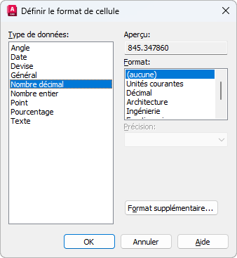 Pour les types de données Angle, Nombre décimal, Point et Nombre entier, ce bouton permet d'ouvrir la boîte de dialogue Format supplémentaire dans laquelle vous définissez des options de formatage complémentaires des cellules du tableau.