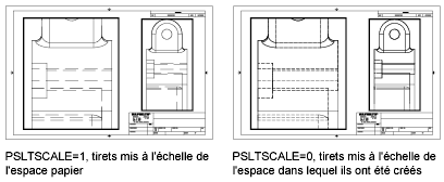 - La variable système PSLTSCALE permet d'appliquer la même échelle aux types de ligne des objets affichés avec différents facteurs de zoom dans la présentation (espace papier) et dans la fenêtre de présentation (espace objet). Par exemple :