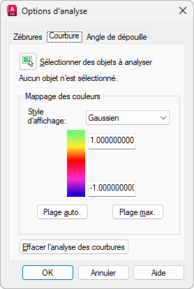 Calcule les plages maximale et minimale de tous les objets sélectionnés pour l'analyse des courbes. (Variables système VSACURVATUREHIGH et VSACURVATURELOW)