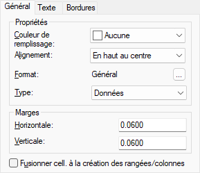 Gère l'espacement entre la bordure de la cellule et le contenu de la cellule. Les paramètres de marge de cellule s'appliquent à toutes les cellules du tableau. Le paramètre par défaut est de 0.06 (système anglo-saxon) et de 1.5 (système métrique).