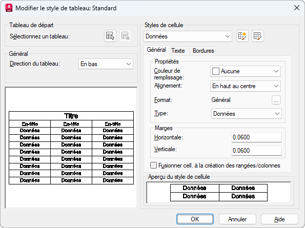 Vous permet de spécifier un tableau dans votre dessin qui sera utilisé comme exemple pour le formatage de ce style de tableau. Une fois que vous avez sélectionné un tableau, vous pouvez spécifier la structure et le contenu à copier de ce tableau vers le style de tableau.