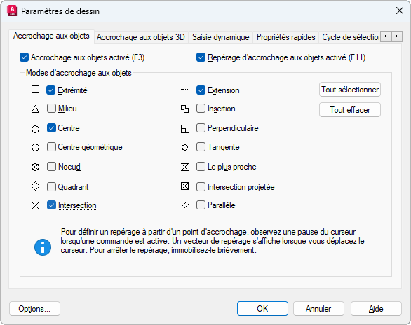 Onglet Accrochage aux objets (boîte de dialogue Paramètres de dessin)