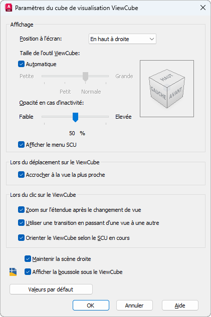 - Modifiez les paramètres de l'outil ViewCube selon vos besoins.