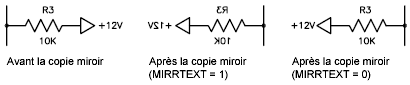 MIRRTEXT s'applique au texte créé à l'aide des commandes TEXTE, ATTDEF ou TEXTMULT, aux définitions d'attribut et aux attributs de variable. Les attributs de texte et de constante qui font partie d'un bloc inséré sont inversés lorsqu'une copie miroir du bloc est effectuée, quelle que soit la valeur de MIRRTEXT.