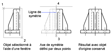 Vous générez le reflet symétrique d'un objet par rapport à un axe appelé ligne de symétrie. Pour définir cette ligne de symétrie temporaire vous devez entrer deux points, vous pouvez choisir de supprimer ou de conserver le modèle d'origine.