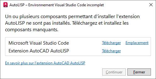 Si Visual Studio Code est installé, mais pas l'extension AutoCAD AutoLISP, AutoCAD télécharge et installe cette dernière avant de lancer Visual StudioCode.