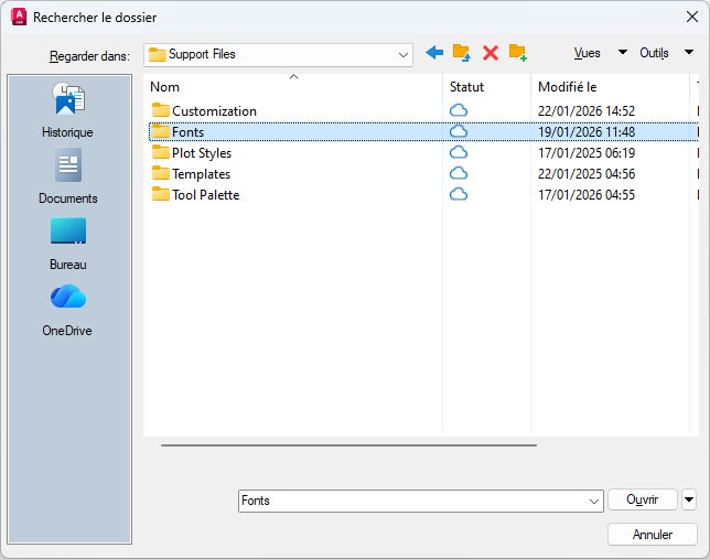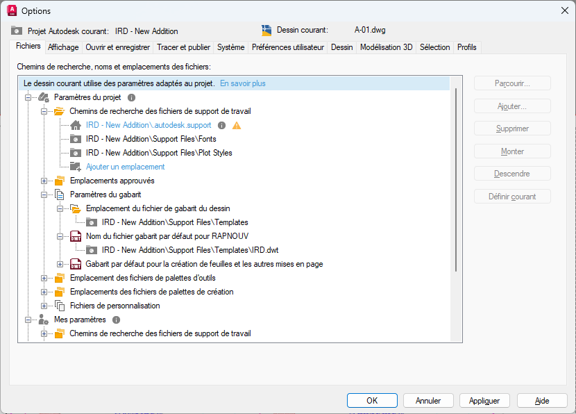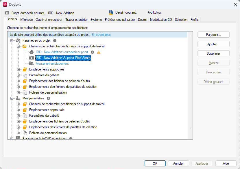 Une fois que vous avez configuré un projet Autodesk dans Forma Data Management pour qu’il utilise les fichiers de support connectés, vous pouvez définir ou modifier les chemins de ces paramètres. Les chemins sont recherchés dans l’ordre dans lequel ils sont répertoriés. Si le même fichier est trouvé dans plusieurs dossiers, la première occurrence trouvée est utilisée. Les paramètres sous Paramètres du projet sont prioritaires sur Mes paramètres, puis sur Paramètres AutoCAD classiques.