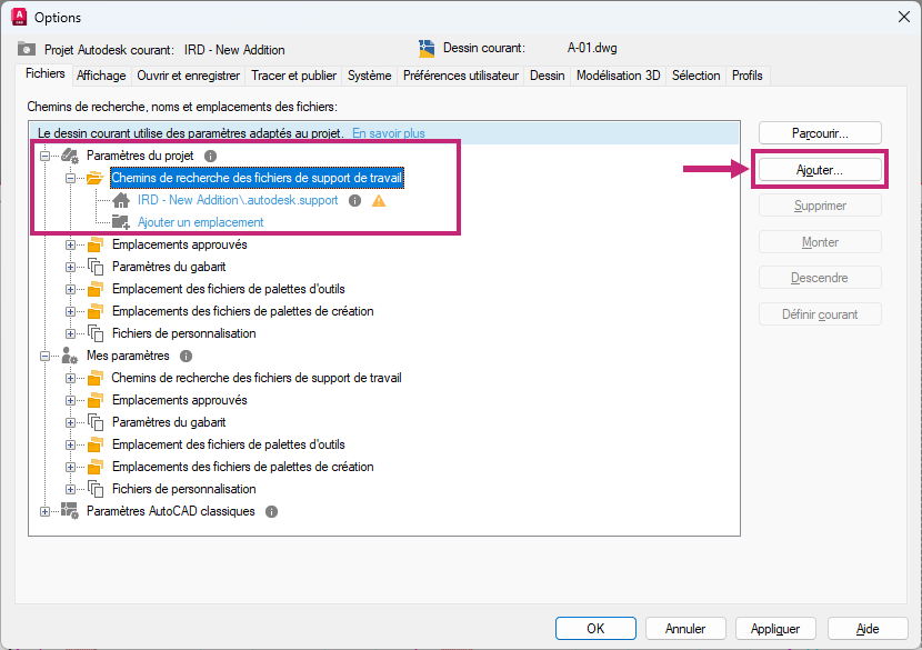 - Vous pouvez également modifier les paramètres de chemin d’accès sous les nœuds Mes paramètres et Paramètres AutoCAD classiques.