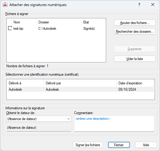 Joint une signature numérique à tous les fichiers répertoriés dans la boîte de dialogue.