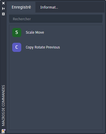 Les macros de commandes enregistrées peuvent être utilisées ou modifiées à partir de cet onglet. Les macros de commandes vous aident à réduire les tâches répétitives et à améliorer vos flux de travail. Lorsque vous utilisez le produit, de nouvelles recommandations de macros de commande sous forme d'informations sur les macros sont disponibles dans l'onglet Informations et enregistrées dans ce dernier.