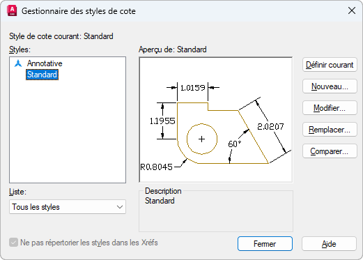 Affiche le nom du style de cote en cours d'utilisation. Le style de cote par défaut est STANDARD. Le style courant est appliqué aux cotes que vous créez.