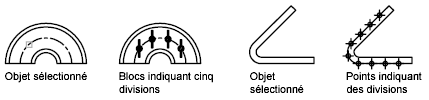 - Spécification d'une valeur correspondant à des distances égales entre les points ou blocs d'un objet sélectionné (commande DIVISER)