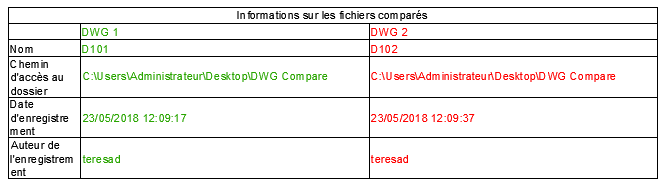 Cette commande ouvre une boîte de dialogue qui affiche des informations sur deux fichiers de dessin comparés. Des options permettent de créer un objet de table avec les informations ou de copier les informations dans le Presse-papiers.