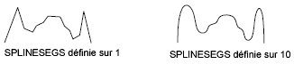 Si vous donnez à SPLINESEGS une valeur négative, le programme génère des segments en utilisant la valeur absolue du paramètre, puis leur applique une courbe avec lissage. Les courbes lissées utilise des arcs comme segments d'approximation. L'utilisation d'arcs permet d'obtenir une courbe générée plus lisse avec un nombre réduit de segments indiqués, mais celle-ci est plus longue à générer.