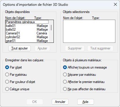 Affiche le nom de tous les objets contenus dans le fichier 3D Studio (3DS) spécifié. Vous pouvez sélectionner 70 objets au maximum.