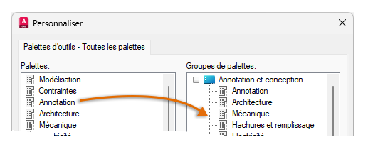 Pour organiser les palettes d’outils et réduire le nombre affiché dans la fenêtre Palettes d’outils, vous pouvez créer et afficher des groupes de palettes d’outils. Un groupe de palettes d’outils limite les palettes affichées dans la fenêtre Palettes d’outils. La boîte de dialogue Personnaliser propose des options de création et d’organisation de groupes de palettes d’outils.