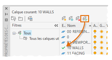 Par défaut, tous les nouveaux objets sont alors dessinés sur le calque actif. La coche verte affichée dans le Gestionnaire des propriétés des calques indique le calque actif.