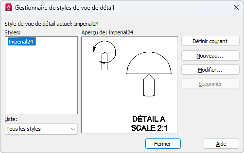 Affiche une liste des styles de vue de détail disponibles dans le fichier de dessin actuel. Le style courant est en surbrillance.