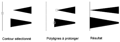 Lorsque vous utilisez le mode standard, il n’est pas nécessaire que les objets sélectionnés, tels que les arêtes sécantes ou les contours, présentent une intersection avec l’objet ajusté. Vous pouvez ajuster ou étendre un objet vers un bord projeté ou vers une intersection extrapolée, c'est-à-dire à l'endroit où il y aurait intersection entre les objets s'ils étaient étendus.