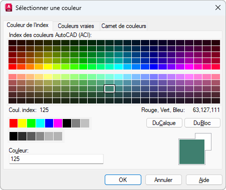 Vous pouvez choisir parmi les 255 couleurs de l'index des couleurs AutoCAD (ACI), les couleurs vraies et les couleurs du carnet de couleurs, disponibles dans les trois onglets.