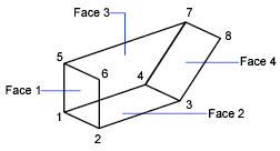 Dans l'illustration, la face 1 est définie par les sommets 1, 5, 6 et 2. La face 2 est définie par les sommets 1, 4, 3 et 2. La face 3 est définie par les sommets 1, 4, 7 et 5 et la face 4 est définie par les sommets 3, 4, 7 et 8.