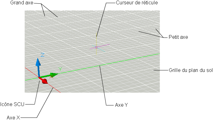 - Plan du sol. Lorsque la projection en perspective est activée, le plan XY du SCU s'affiche sous la forme d'un plan du sol avec une couleur de gradient. Le plan du sol affiche un gradient entre l'horizon au sol et l'origine du sol.