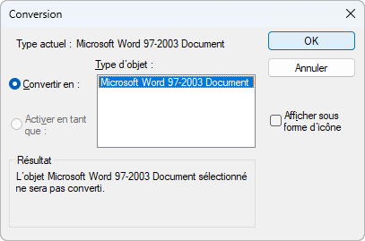Affiche le type de l'objet que vous avez activé ou que vous souhaitez convertir.