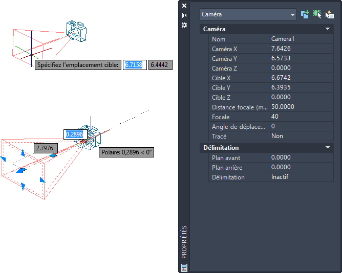 Vous pouvez modifier la distance focale d'une caméra, changer ses plans de délimitation avant et arrière, nommer une caméra et activer ou désactiver l'affichage de toutes les caméras dans un dessin.