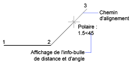 Utilisez PolarSnap™ pour accrocher des objets à des distances indiquées le long de la trajectoire d'alignement polaire. Dans l'illustration suivante, par exemple, il s'agit de tracer une ligne de deux unités de long entre le point 1 et le point 2, puis de tracer une autre ligne, de même longueur, jusqu'au point 3, selon un angle de 45 degrés par rapport à la ligne. Si vous activez l'incrément d'angle polaire de 45 degrés, un chemin d'alignement et une info-bulle s'affichent lorsque le curseur traverse un angle de 0 ou de 45 degrés. Le chemin d'alignement et l'info-bulle disparaissent quand vous éloignez le curseur de cette position.