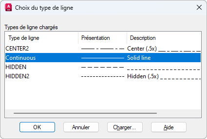 Affiche les types de ligne disponibles dans le dessin courant.
