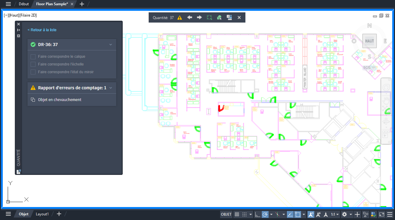 La palette Nombre affiche les noms de blocs et le décompte correspondant pour chaque bloc. Lorsque vous êtes dans un décompte actif, la palette Nombre affiche des détails sur le décompte, y compris le rapport d'erreurs, le cas échéant. Le rapport répertorie les erreurs de quantité, telles que les objets superposés, décomposés ou renommés. Cliquez sur l'erreur de quantité pour effectuer un zoom avant et vérifier l'objet.
