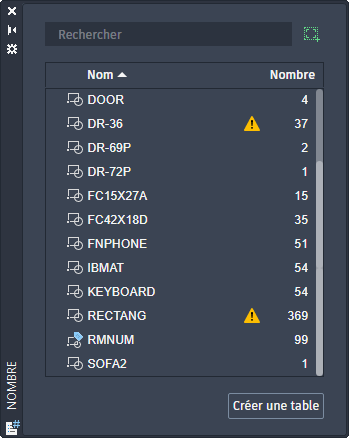 Insère une table contenant les noms des blocs et la quantité correspondante de chaque bloc dans le dessin.