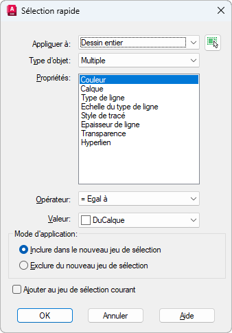 Si l'option Ajouter au jeu de sélection courant est sélectionnée, les critères de filtrage sont appliqués à la totalité du dessin.