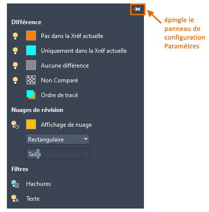 Le groupe de fonctions Paramètres détermine la manière dont les différences, les nuages de révision et les filtres des objets de hachures et de texte sont affichés dans un résultat de comparaison de Xréfs. Pour les modifications fréquentes, vous pouvez ancrer le groupe de fonctions Paramètres pour y accéder plus facilement.
