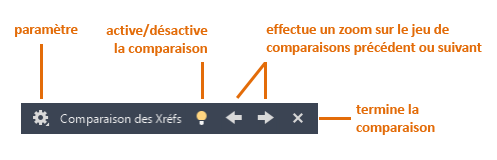 Lorsqu’une comparaison des Xréfs est lancée, la barre d’outils Comparaison des Xréfs s’affiche.