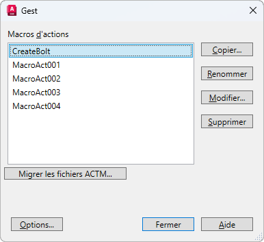 Copie, renomme, modifie, supprime et migre les fichiers de macro d'actions.